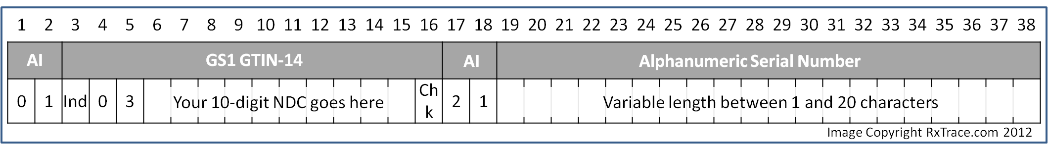 A GTIN element string is always 14 digits long when it is depicted using AI “01”. Remember that the FDA defined their serial number as being up to 20 alphanumeric characters. That means that it is a variable length value ranging from 1 to 20 characters. It is a happy coincidence that GS1 defines their serial number element string for AI “21” in exactly the same way! Well, in fact, the FDA made the decision to specifically align their definition with that of GS1’s existing AI “21” definition so that there wouldn’t be any conflict if people chose to use GS1 standards to implement the sNDC.