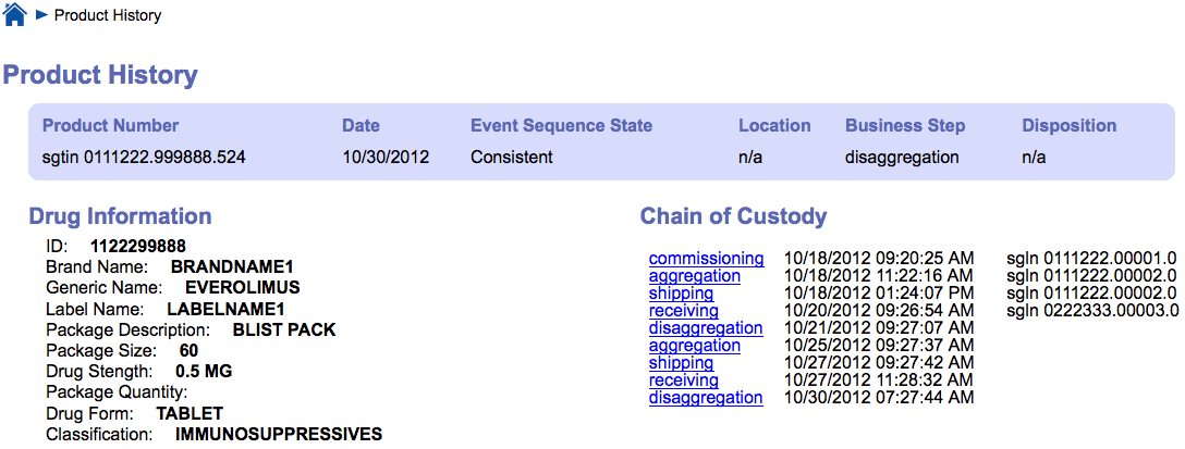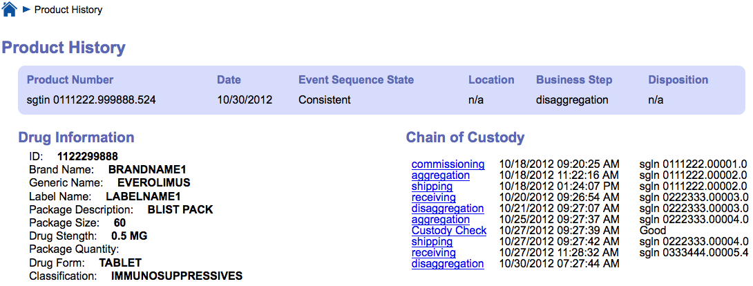 Every event shown in each of these figures can be expanded to show the full or filtered event data by clicking on the event link. In addition, the central service could provide the manufacturer and/or authorized investigators with exception reports that would include the list of all of their drugs that currently do not have a consistent supply chain history.
